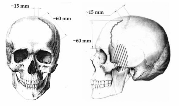 – от переднего края левой височной кости вперед и вверх трещина длиной до 6,0 см и с расхождением краев до 0,1 см, трещина расположена от стреловидного шва на расстоянии 1,5 см;