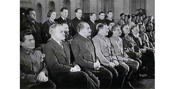 Тот самый «сталинский Ареопаг», каждый член которого несёт персональную ответственность за чудовищную волну террора, точнее, целый ряд последовательных волн, что захлёстывали Советский Союз в 1930-е гг. Слева направо: Ежов, Молотов, Каганович, Жданов, Сталин, Ворошилов, Калинин, Андреев, Микоян. Странно слышать оправдания современных демагогов, доказывающих, будто во время «Большого террора» расстреляли «всего-то» 600 тыс. человек, что в масштабах огромной страны, вроде бы как и немного… Террор не исчерпывался репрессиями одного только 1937 г. Бессовестное раскулачивание – это тоже террор в отношении невинных, людоедский «закон о трёх колосках» – это тоже разновидность террора, замаскированного под уголовное наказание, высылки «лишенцев» из крупных городов без суда и следствия – это тоже террор! Сейчас об этом стараются не вспоминать, но помнить о системе централизованного коммунистического террора необходимо. И знать его творцов в лицо и по фамилиям – тоже.