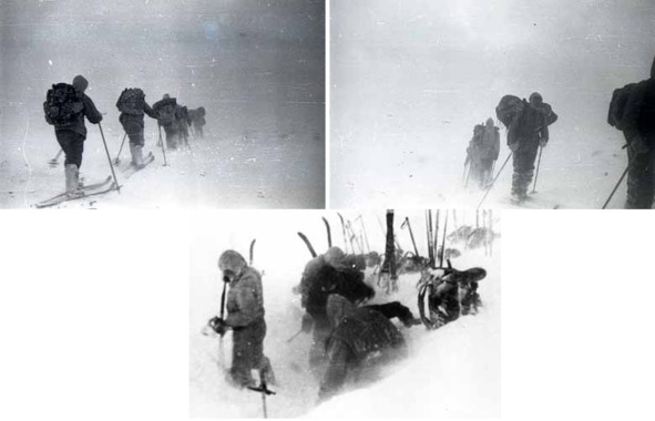 Эти фотографии считаются последними снимками группы Игоря Дятлова. Следствие посчитало, что фотоснимки сделаны около 17 часов 1 февраля 1959 г. во время восхождения группы на перевал и постановки палатки на склоне Холат-Сяхыл.
