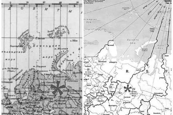 Это фрагменты карт с указанием деления территории СССР на часовые пояса. Справа: карта 1940 г., часовой пояс Свердловской области соответствует истинному времени на её территории (+4 часа к времени по Гринвичу). Слева: карта после мартовской реформы 1957. Время Свердловской области прибавило 1 час, перестав соответствовать истинному. Представьте ощущения человека, перелетевшего из Воркуты в более западную Пермь, в его сутках окажется 26 часов..! Знаком «*» показано приблизительное положение горы Холат-Сяхыл.