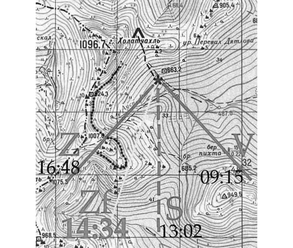 Эта схема позволяет наглядно представить видимый из лагеря «дятловцев» путь Солнца по небосводу 1 февраля 1959 г. Условные обозначения: «*» – место лагеря группы Дятлова в долине р. Ауспия; «V» – направление на восход Солнца в 09:15, который туристы не могли видеть, т. к. Солнце выходило из-за горизонта за склоном горы 949,5 м.; «S» – истинный полдень в 13:02, в это время Солнце пересекло меридиан лагеря и находилось от него строго на юге; «Z» – направление на закат, который д.б. произойти на широте лагеря в 16:48 (как и восход, его туристы не могли бы видеть из лагеря из-за искажённой горами линии горизонта); «Zf» – закат фактический, имевший место в 14:34. В это время Солнце зашло за отрог Уральских гор при высоте стояния около 6°30» и более не показывалось. Группа Дятлова с этой минуты оказалась в условиях резко ухудшившейся видимости. Чёрный пунктир «…» обозначает высоты 900 м., угловая высота которых превышала высоту стояния Солнца после 14:34 для наблюдателя, находившегося в лагере «дятловцев». Серый пунктир " – -" условно показывает направление и длину последнего перехода группы.