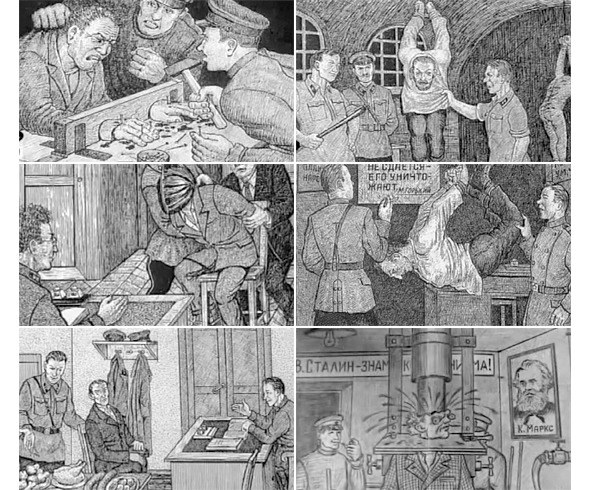 Фрагменты нескольких зарисовок Д. С. Балдаева, посвященных допросам и пыткам в органах охраны правопорядка сталинской поры. Ветеран советского МВД, полковник милиции Данциг Балдаев начинал свою карьеру в органах внутренних дел в 1948 г. в Ленинграде. Сначала он был пожарным, затем – тюремным контролёром, после окончания школы милиции попал в уголовный розыск. Балдаеву довелось общаться с теми самыми офицерами ленинградской комендатуры МГБ, что были причастны к репрессиям 1930-х гг. (Август Беккер, Георгий Жёмов и др.). Потрясенный их рассказами о методах ведения следствия, пыток и казней, Балдаев принялся рисовать миниатюры, каждая из которых основывалась на каком-то реальном эпизоде. Уже после распада Советского Союза более 300 зарисовок Балдаева были изданы как в России, так и за рубежом. Автор настоятельно рекомендует ознакомиться как с самими рисунками Данцига Сергеевича, так и его пояснениями к ним – более выразительную характеристику той эпохи сложно представить…