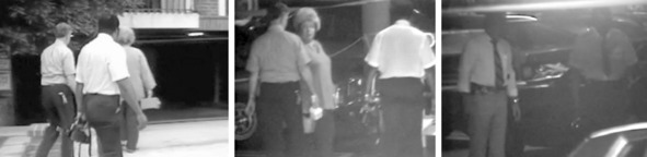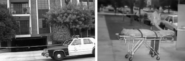 На этих кадрах из телерепортажа, снятого журналистами ранним утром 26 сентября, запечатлены криминалисты, входящие в паркинг на Кайова авеню, дом №11663 и детективы, занятые осмотром места преступления.