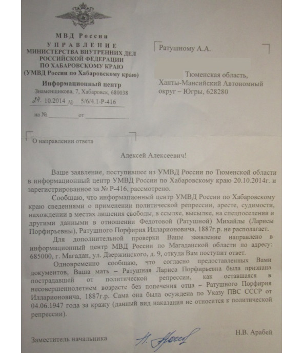Зачем мне информация о том, что моя мама пострадала от политических репрессий, если я это знаю и без ХабаровскогоИнформцентра УМВД РФ?