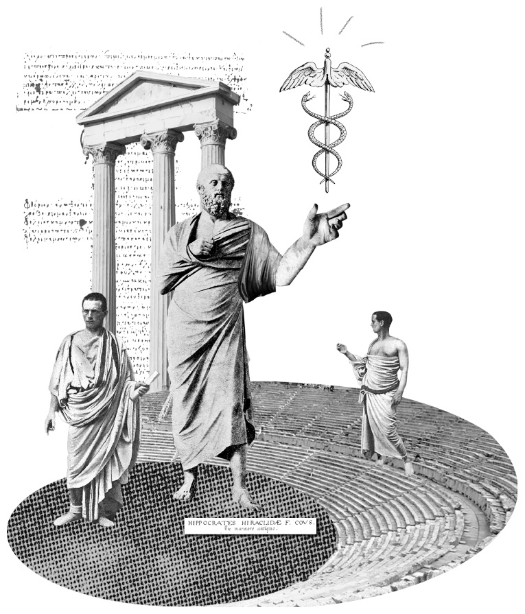 Кто написал этот текст, доподлинно не известно, что совсем не удивительно ввиду его древности. Скорее всего, это плод коллективного творчества, растянутый во времени, тем более что достоверно известно о неоднократном изменении текста клятвы Гиппократа. Каким образом ее принимали, мы тоже точно не знаем. Воображение рисует древнего грека – закутанного в тогу мужчину средних лет, с чернявой благородной бородой и широкой лысиной – вроде тех «Гиппократов», что продаются в Афинах за пять евро (но можно сторговаться и за один), который наконец-то окончил обучение в медицинской школе. Годы учебы позади. Позади жизнь в древнегреческой общаге, бессонные ночи, сессии, экзамены, крики «Халява, приди!» и работа ночным санитаром в древнегреческом морге. Он выходит в центр арены театра, на трибунах которого сидят его коллеги (все поголовно мужчины), также закутанные в тоги, и торжественно произносит текст клятвы: «Клянусь Аполлоном врачом, Асклепием…» Все аплодируют, и новоиспеченному доктору вручается диплом, за который он предварительно сдал несколько драхм. После торжественной официальной части «молодые» врачи отправляются обмывать дипломы к гетерам в диктерион. Вряд ли было именно так, скорее всего, все происходило гораздо прозаичнее, но тот факт, что клятве в то время придавалось гораздо более серьезное значение, нежели в наше время, не вызывает сомнения.