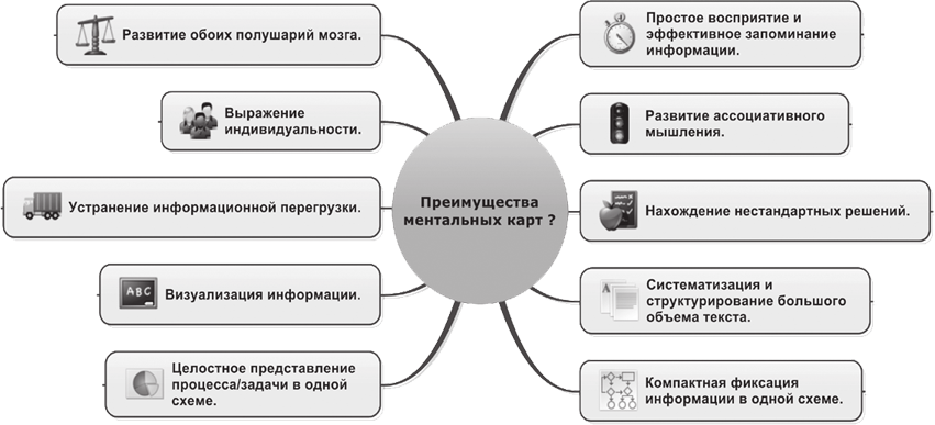 Включив ментальные карты в свой бизнес и жизнь, вы больше не будете страдать от информационной перегрузки. Наглядность представления материала поможет разобраться в устройстве процесса, увидеть его структуру и быстро в него «влиться». Кроме того, ментальные карты аккумулируют все необходимые для данного процесса, события, задачи и т. д. данные в одном месте, тем самым устраняя необходимость их сбора из многочисленных заметок, заброшенных куда-то обрывков бумаги, а также исключая утрату или упущение из виду важного материала.