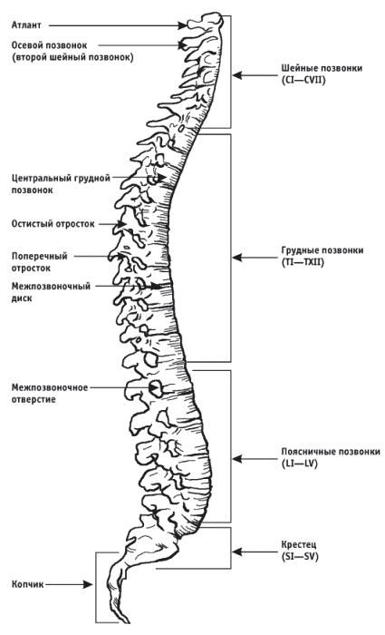 Позвоночник состоит из нескольких отделов (рис. 1). В шейном отделе насчитывается 7 позвонков (в медицине их принято обозначать СI–СVII), в грудном – 12 (TI–TXII), в поясничном – 5 (LI–LV), в крестцовом – 5 позвонков (SI–SV), сросшихся воедино. Кроме того, от 3 до 5 маленьких позвонков также есть в копчике.