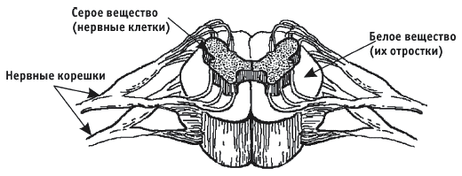 Все сегменты устроены одинаково. Они состоят из серого и белого вещества, как и головной мозг. Серое вещество, то есть нервные клетки, находится в центре и по форме напоминает крылья бабочки или букву Н (рис. 6). Вокруг нервных клеток проходят пучки, или тракты, аксонов.