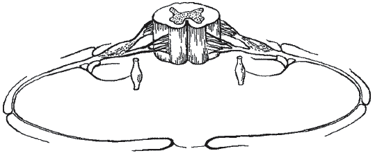 От нервных клеток спинного мозга, то есть от правой и левой половины каждого сегмента, парами отходят основные отростки-аксоны, из которых образуются левый и правый нервы сегмента. Поперечный отрезок спинного мозга и связанные с ним правые и левые спинномозговые нервы, через которые головной мозг контролирует определенный участок тела, называются нервным сегментом (рис. 7).