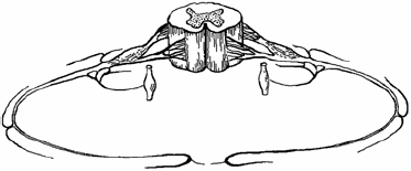 От нервных клеток спинного мозга, т. е. от правой и левой половины каждого сегмента, парами отходят основные отростки-аксоны, из которых образуются левый и правый нервы сегмента. Поперечный отрезок спинного мозга и связанные с ним правые и левые спинномозговые нервы, через которые головной мозг контролирует определенный участок тела, называется нервным сегментом (рис. 7).
