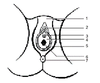 1 – лобок; 2 – клитор; 3 – уретра (отверстие мочеиспускательного канала); 4 – малые половые губы; 5 – большие половые губы; 6 – вход во влагалище; 7 – анальное отверстие