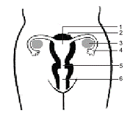 1 – полость матки; 2 – матка; 3 – яичник; 4 – маточная труба; 5 – шейка матки; 6 – влагалище