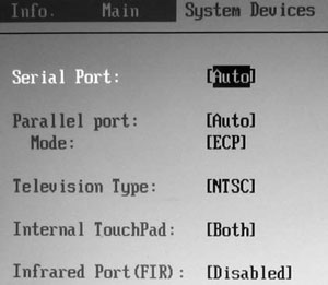 Секция System DevicesВ секции System Devices настраиваются параметры работы портов, расположенных на ноутбуке (рис. 6.3).