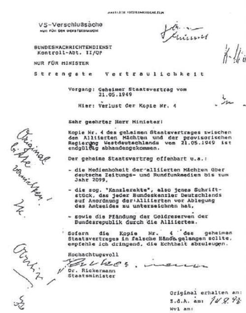 Копия номер 4 тайного государственного договора между военными союзниками и переходным правительством Западной Германии от 21.05.1949 окончательно исчезла.