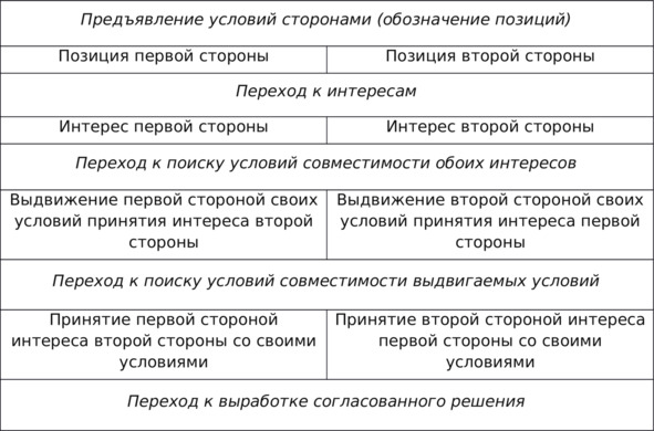 Задача интегративного разрешения конфликтов и состоит в том, чтобы переформулировать предмет переговоров (предмет спора), перейдя от предъявляемых участниками позиций к стоящим за ними интересам.