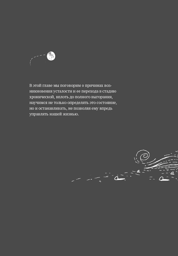 Хроническая усталость подобна болоту: засасывает незаметно, но основательно. «Мне всего-то надо добраться во-о-он до той заманчивой кочки. Ничего страшного, что ноги засосало по щиколотку. Еще пару шагов. Не беда, что увяз по колено, осталось совсем чуть-чуть», – говорим мы себе, увязнув по грудь и понимая, что не можем сдвинуться с места. Зачем были все эти усилия, если до цели рукой подать, а мы не в силах даже пальцем пошевелить? Риск забуксовать и слечь от переутомления оказался реальнее желанной цели. Исследования подтверждают, что с бо́льшей вероятностью достигают своих целей те, кто движется размеренно и с небольшими перерывами на отдых, давая себе таким образом возможность восстановить силы для следующего рывка. Те же, кто пытается за один раз преодолеть сразу весь путь, выдыхаются задолго до финиша.