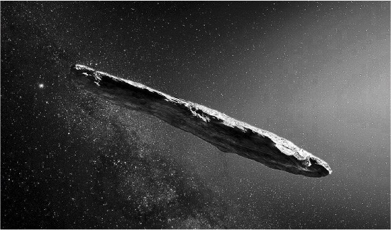 Предсказание гиперболических орбит (возможность которых Кеплер, очевидно, не мог и подозревать) – это демонстрация силы математических методов и самого подхода к познанию, основанного на причинах явлений. В течение трех сотен лет можно было не наблюдать в Солнечной системе ни одного тела, летящего по гиперболе, и тем не менее ни у кого не было сомнений, что такое возможно – что в Солнечную систему может залететь гость извне, побыть здесь недолго и распрощаться навсегда, с необходимостью следуя по какой-то гиперболе. Такой гость издалека был замечен 19 октября 2017 г. и вскоре наречен Оумуамуа (рис. 1.6). Сейчас этот астероид, когда-то, видимо, выброшенный из какой-то иной планетной системы, уже вычерчивает «уходящую» от нас часть гиперболы. 30 августа 2019 г. была открыта и межзвездная комета 2I/Borisov. Кроме того, пять рукотворных объектов сейчас движутся «вокруг» Солнца по гиперболам, это значит, что они покидают Солнечную систему. Это «Пионер-10» (запущен в 1972-м), «Пионер-11» (1973), «Вояджер-1», «Вояджер-2» (1977) и «Новые горизонты» (2006).