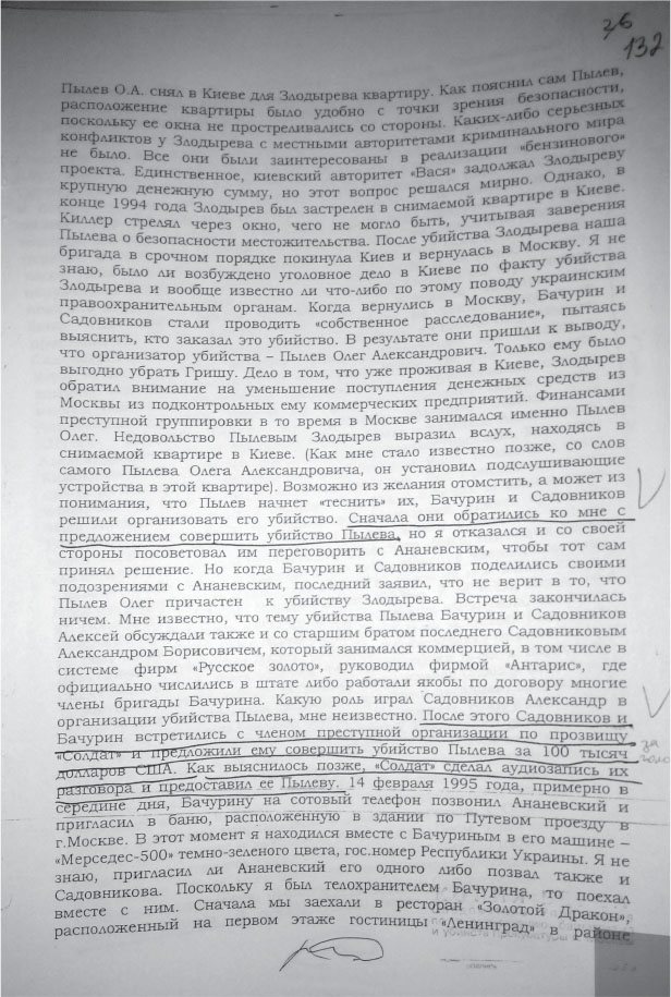 Фотокопия страницы допроса Грибкова В. Злодырев – это Гусятинский Григорий, в то время по паспорту был Злодыревым, взяв на время, после освобождение фамилию двоюродного брата. Не всему в его показаниях можно верить, многого он не мог знать, поскольку был водителем, и лишь после гибели «Усатого», перейдя в подчинение Пылева Олега, стал его киллером. На этой страницы его показания о причинах убийства Бачурина Юрия «Усатого» и Алексея Садовникова – «Банщика», так же некоторые его подробности.