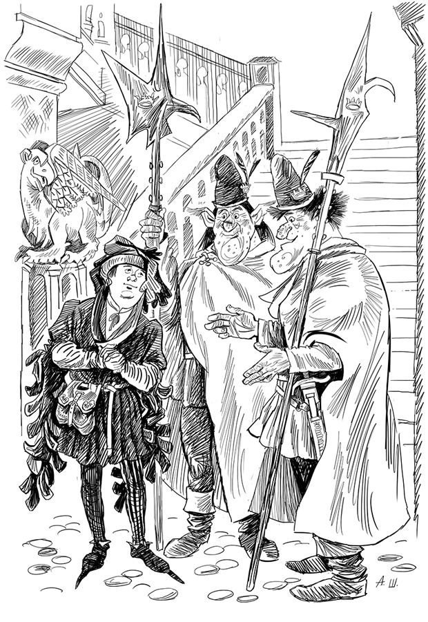 Прыгун поклонился и спустился по длинной лестнице во двор королевского замка. Там в серебристых плащах прогуливались пять дежурных гоблинов королевской гвардии, готовых выполнить приказ своего капитана. Прыгун передал королевский приказ Буруну, и оба они поднялись по лестнице. А к гоблинам тут же подошёл улыбающийся Горожанин от горожан.