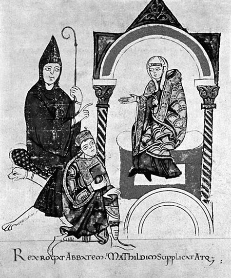 Генрих IV обращается к Матильде Тосканской и Гуго Клюнийскому за помощью. Старинная миниатюра