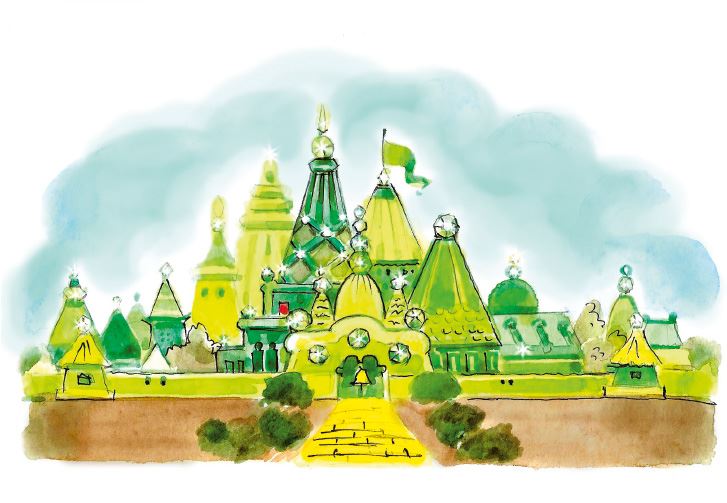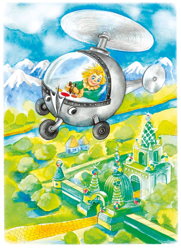 Как красива Волшебная страна с такой высоты! Страшила с восторгом озирался вокруг. Внизу расстилались зелёные луга, вспаханные поля, голубой змейкой струилась река, вдалеке темнела кромка леса. Прямо по курсу высились башни Изумрудного города – самого прекрасного города на Земле.