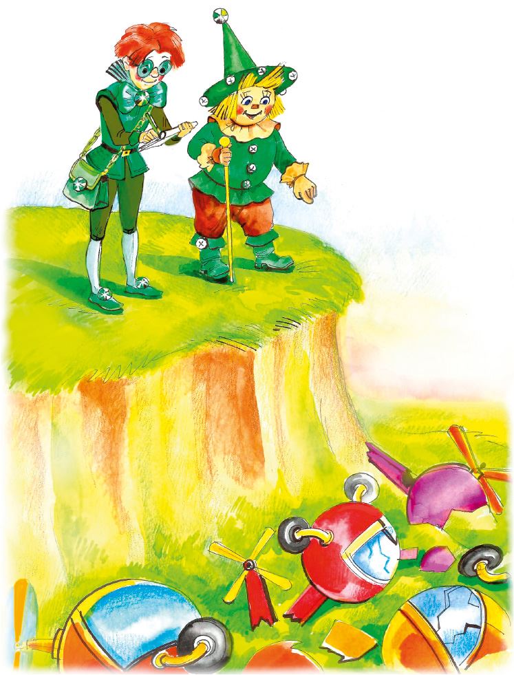 И вот в Ранавире закипела работа. Страшила был в гуще событий. Вместе с Лестаром, лучшим мастером Фиолетовой страны, и его молодыми помощниками он переходил от вертолёта к вертолёту, карабкался в кабины, бесстрашно дёргал за обломанные рычаги и пытался нажимать на разбитые кнопки. Бархатный зелёный костюм покрылся грязью и машинной смазкой, но выглядел правитель очень довольным.