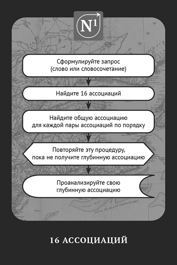 После четвертого шага из 16 ассоциаций у вас получилось восемь. Проделайте с ними ту же процедуру: объедините слова попарно и получите четыре новые ассоциации. Далее вновь ищете общую ассоциацию и получаете два слова. После их объединения вы получите финальную, глубинную ассоциацию – ключ к решению вашей проблемы.