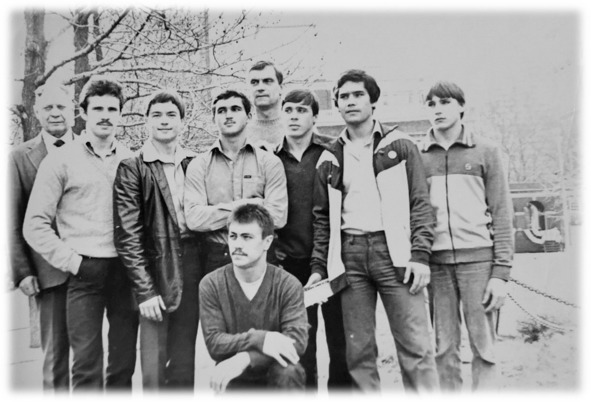 Делегация спортивного общества Буревестник в США 1982 год. (слева направо) Лукьянов, Симаков, Артёмов, Габитов, Баранов, Атаханов, Могильный. Сзади – шеф делегации Драчевский, спереди Тихоньких.