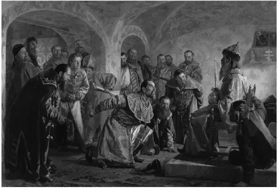 Ивану Грозному принадлежит выражение, которое можно было бы назвать крылатым, если бы не грозный смысл его: «А жаловати есмя своих холопей волны, а и казнити волны же есми были»[14], – так писал он в первом послании к князю Курбскому в июле 1564 г. Герои романа Толстого полностью согласны с этим убеждением, и князь Серебряный говорит: «Впрочем, чему дивиться. Царь волен казнить своих злодеев!» И боярин Морозов отвечает ему: «Кто против этого, князь. На то он царь, чтобы карать и миловать. Только то больно, что не злодеев казнили, а всё верных слуг государевых…» И сам Грозный говорит так: «…напрасно ты винишь меня, князь. Царь казнит тех, на кого злобу держит, а в сердце его не волен никто. Сердце царево в руце Божией, говорит писание».
