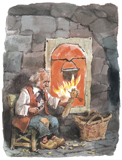Карло вошёл в каморку, сел на единственный стул у безногого стола и, повертев так и этак полено, начал ножом вырезывать из него куклу.
