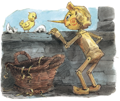 Первым делом он вырезал на полене волосы, потом – лоб, потом – глаза… Вдруг глаза сами раскрылись и уставились на него… Карло и виду не подал, что испугался, только ласково спросил: