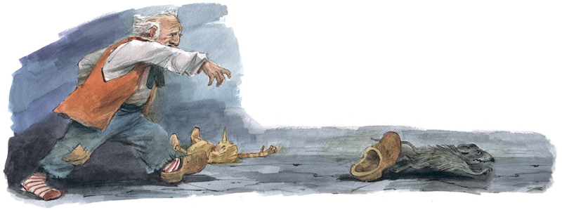 Дверь распахнулась, вошёл папа Карло. Стащил с ноги деревянный башмак и запустил им в крысу.