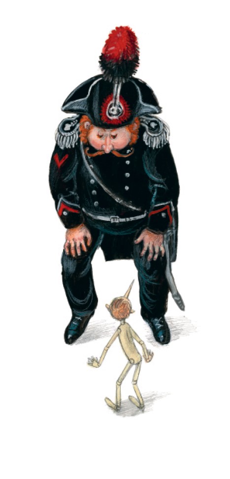 Прохожие смеялись, показывая пальцами на бегущего Буратино. На перекрёстке стоял огромный полицейский с закрученными усами и в треугольной шляпе.
