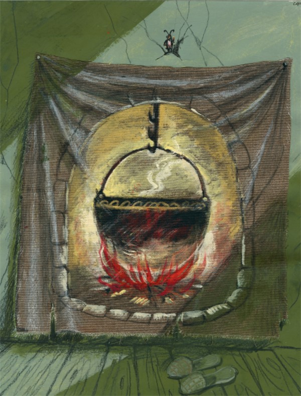Карло жил в каморке под лестницей, где у него ничего не было, кроме красивого очага – в стене против двери. Но красивый очаг, и огонь, и котелок, кипящий на огне, были не настоящие – нарисованы на куске старого холста.
