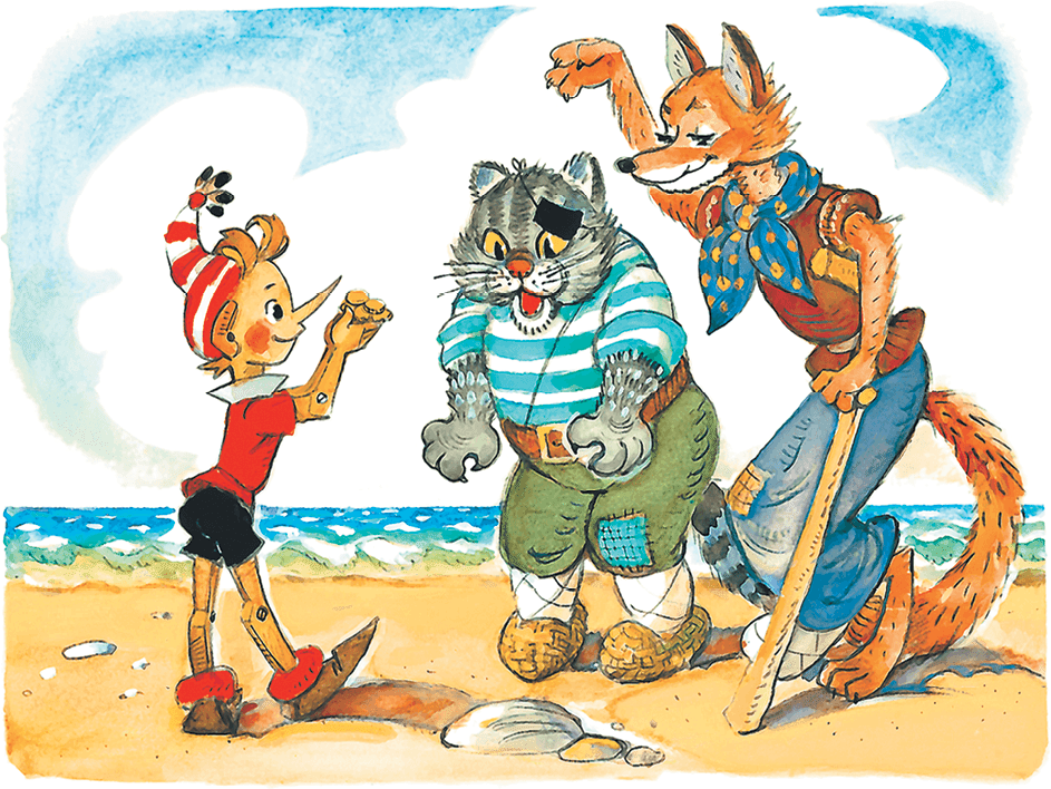 По дороге домой Буратино встречает двух нищих – кота Базилио и лису Алису