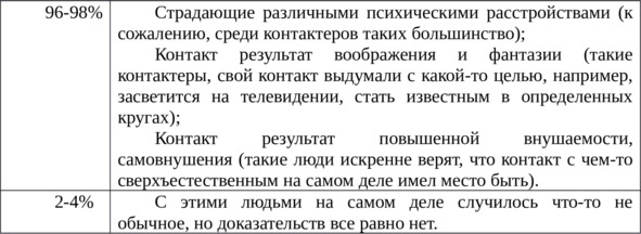 Теперь поговорим о моих исследованиях контактерства и каким выводам пришел я. Во-первых, я разработал два психологических теста «Особенности мистической личности» и «Метод черно-белых фигур» (тест на воображение, ассоциации, фантазии). По поводу самих контактеров, могу сказать, что все же не все они сумасшедшие, 3—4% на самом деле случилось что-то не известное и не понятное, однако проблема заключается в том, что эти люди не очень хотят афишировать, то что с ними случилось, ну по разным причинам. Не каждый человек захочет, чтобы его как подопытную мышку исследовали в лаборатории, капались в его психики комиссия из психиатров, психологов и других специалистов, однако я не устою повторять, что исследование контактантов должно проводиться комплексно и разными специалистами в разных сферах. Я сделал примерную процентную разбивку какие бывают контактеры, у меня получилось следующее:
