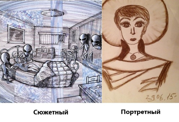 Рисунки контактеров можно делить на две большие группы – это сюжетные и портретные рисунки. К сюжетные рисунки изображают саму контактную ситуацию или отрывок из нее.
