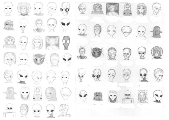 Все фигуры на рисунке особенно портретные носят психологическое отражение автора рисунка. Некоторые психологи, когда анализируют рисунок утверждают, что изображение фантастических человекоподобных существ признак психопатологии – это не всегда так, но в некоторых случаях это имеет место быть. Часто авторы рисунков (контактеры) страдают шизофренией, приведу характерные особенности для рисунков шизофреников: