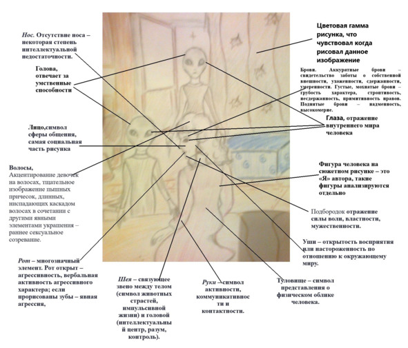 Все фигуры на рисунке особенно портретные носят психологическое отражение автора рисунка. Некоторые психологи, когда анализируют рисунок утверждают, что изображение фантастических человекоподобных существ признак психопатологии – это не всегда так, но в некоторых случаях это имеет место быть. Часто авторы рисунков (контактеры) страдают шизофренией, приведу характерные особенности для рисунков шизофреников:
