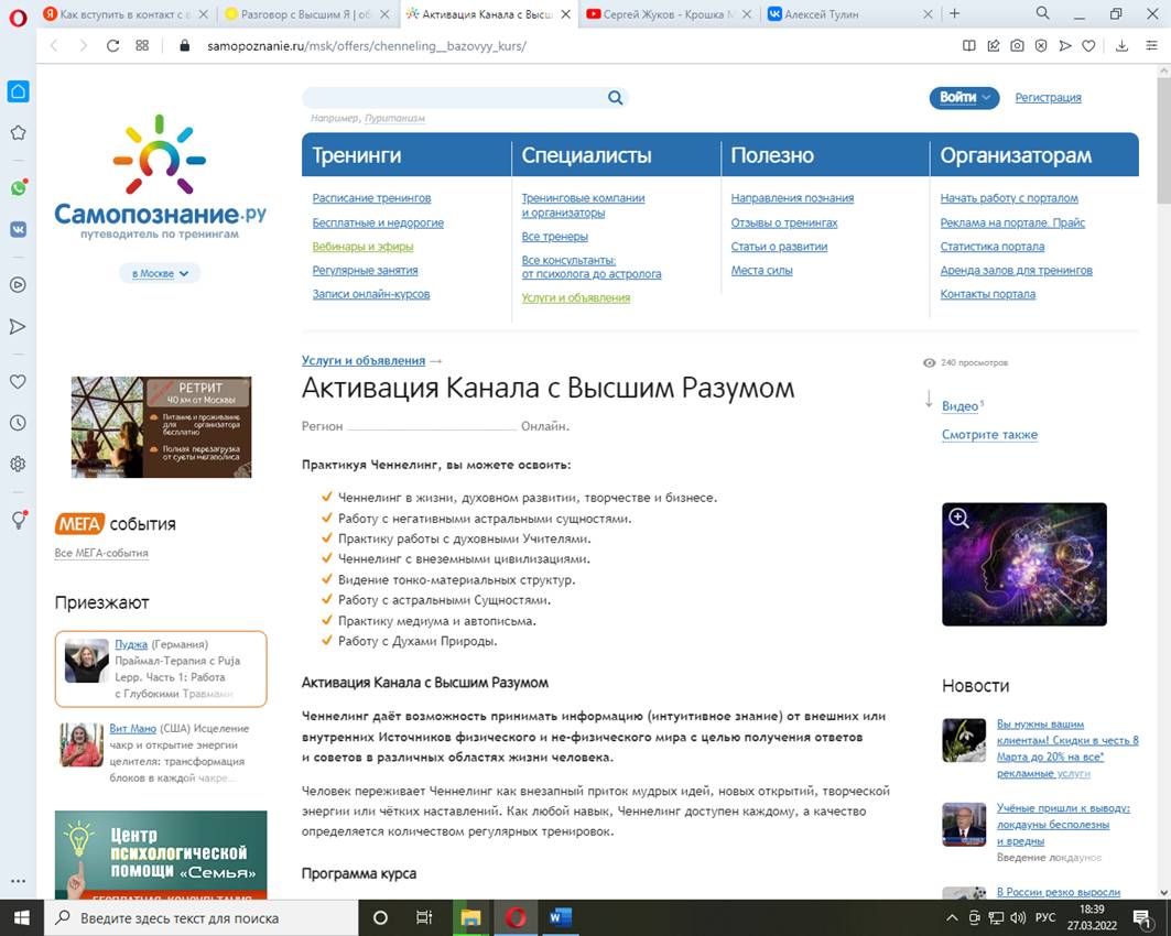 Вот, например на психолого—эзотерическом портале «Самопознание. ру» нашел такой тренинг «Активация Канала с Высшим Разумом» стоимость курса 75 тысяч рублей, причем я уверен, что за последствия, и возможное психические расстройство после тренинга, авторы данного мероприятия ответственности не несут.