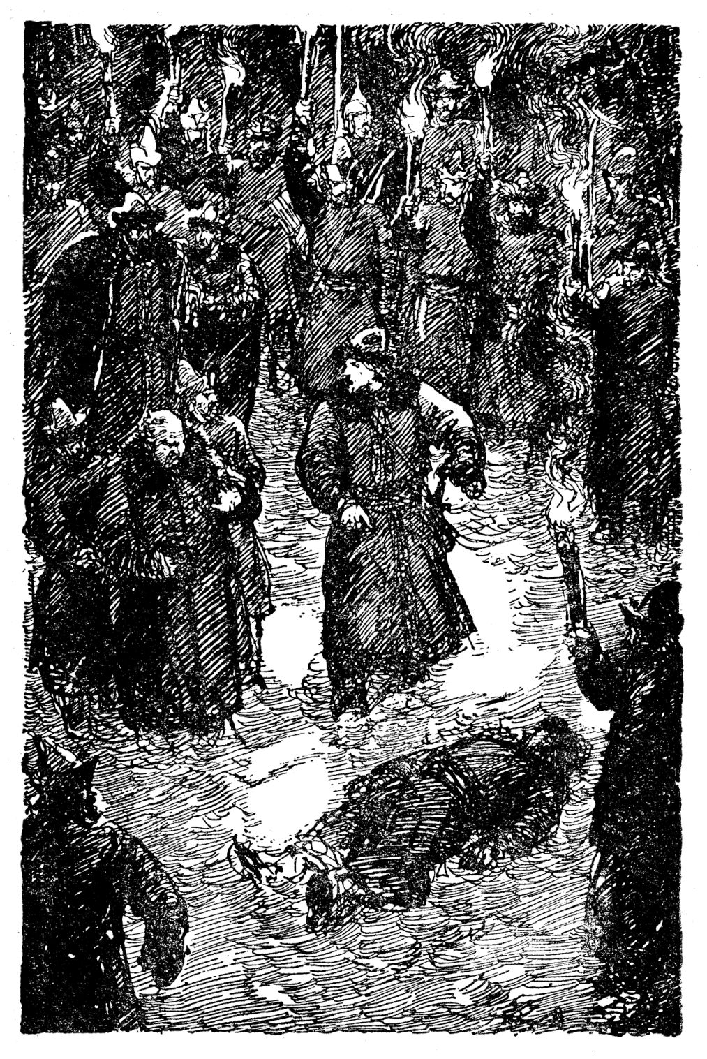 Одним прыжком Даниил очутился на снегу. Оба кинулись к новгородским. А там уже, у последнего возка, пылали во множестве берестяные факелы в руках рослых дружинников, багровым светом своим озаряя сугробы и угрюмые лица воинов.