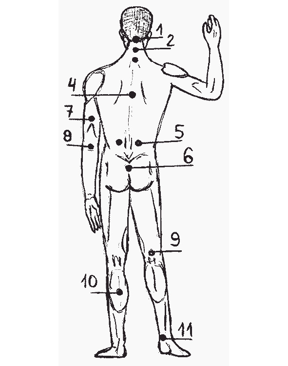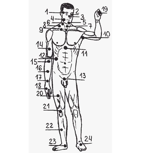 Цифрами 1—5 обозначена степень болевого воздействия в результате нанесения удара той или иной силы в указанную болевую точку.