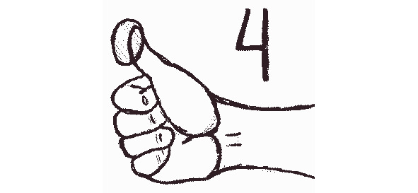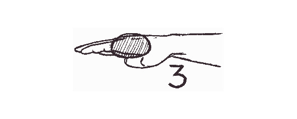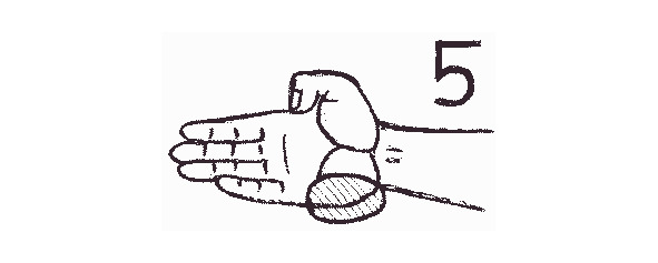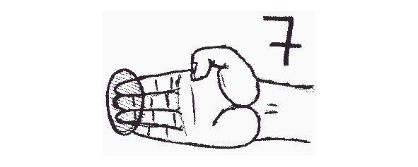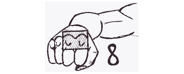 7- Сжатые вместе пальцы. Их нужно крепко удерживать вместе, чтобы они не разъединились в момент контакта с целью. Средний палец следует немного подогнуть, чтобы он оказался на одном уровне с другими. Эти меры обеспечивают одновременный контакт тремя кончиками пальцев.