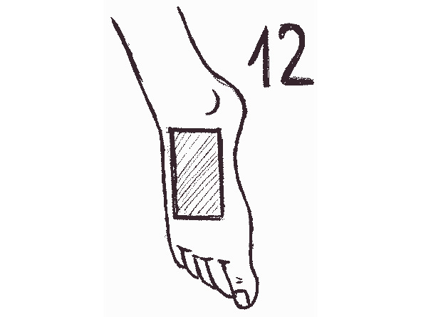12- Подъем ступни. Это довольно хрупкая область, которую следует использовать с осторожностью. Чем сильнее при этом пальцы скручены внутрь, а стопа оттянута вниз, тем крепче становится область подъема. Это происходит за счет растяжения и сокращения сухожилий, проходящих вдоль передней стороны ступни.