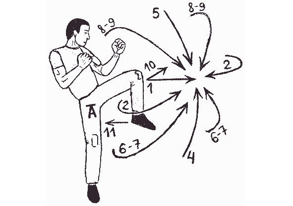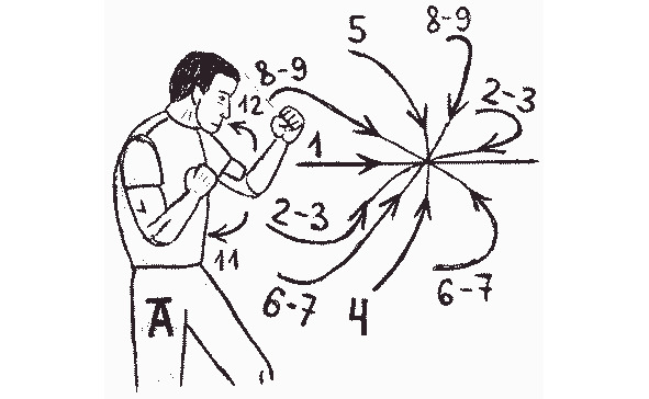 рисунок 5- Основные удары и пинки: 1- прямой; 2- правый боковой и левый боковой; 3-левый обратный (наотмашь) и правый обратный; 4- снизу; 5- сверху; 6- правый нижнебоковой и левый нижнебоковой; 7- левый нижнеобратный и правый нижнеобратный; 8- правый верхнебоковой и левый верхнебоковой; 9- левый верхнеобратный и правый верхнеобратный; 10- пинок в сторону; 11- удар и пинок назад снизу; 12- удар назад через плечо.