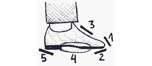 рисунок 7 (2) – Ударные сегменты обутой стопы: 1- носок; 2- передняя часть подошвы; 3- область язычка и шнуровки; 4- вся область подошвы; 5- область пятки.