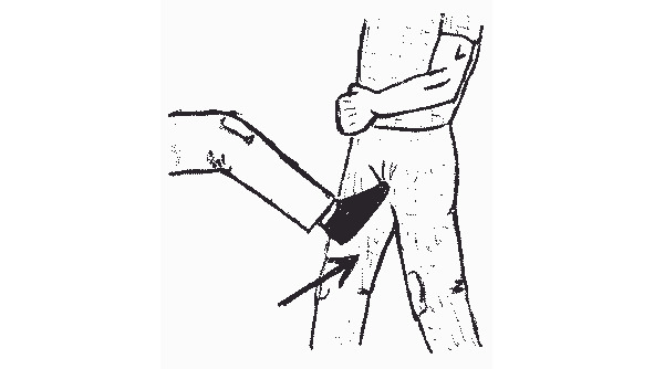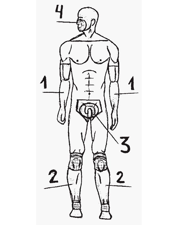 + Третья по значению цель, в которую уже сложнее попасть – это пах (двигатель танка) и низ живота (механик-водитель танка) (рис 3—3). Эти точки – это «слабый участок брони» вражеского танка. Сильно и метко попав в двигатель (пах), можно надолго вывести нападающего из строя, а хорошо пнув в низ его живота (механик-водитель) ногой, можно временно (секунд на 10 и более) лишить танк управления.