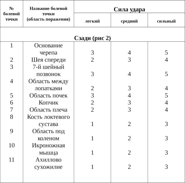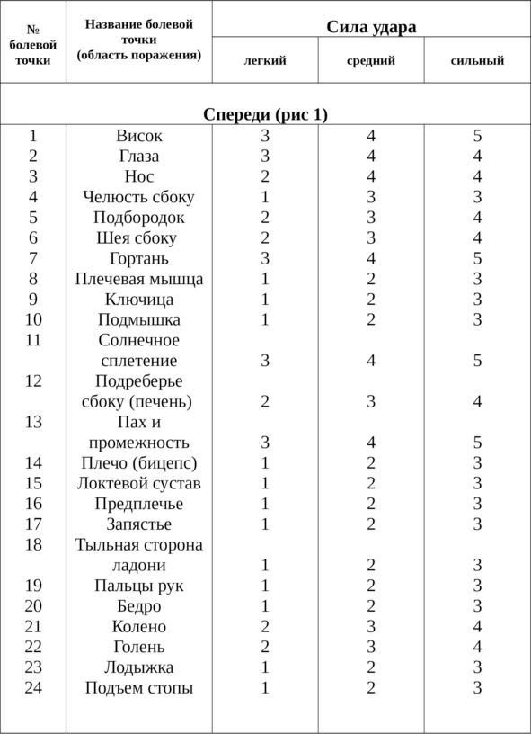 Удары рукой, ногой и различными предметами (палка, бутылка, металлический прут и др.) являются основным способом атаки злоумышленника и основным способом обороны и контратаки защищающегося. Любой удар будет эффективен лишь в том случае, когда он наносится внезапно и обязательно точно в болевую точку (уязвимое место). На рисунках 1 и 2 показано расположение этих точек на теле человека, а ниже описывается степень воздействия на эти точки ударов различной силы.