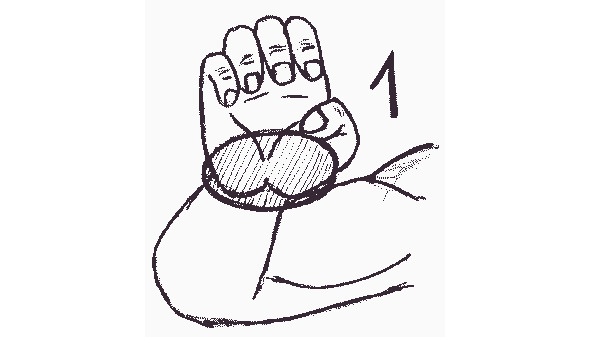 1- Основание ладони. Ударная зона включает в себя мягкую, покрытую толстыми мышцами часть руки у основания большого пальца и самой ладони. Запястье при ударе следует отогнуть наружу под углом 90 градусов. Еще большего сокращения мышц и сухожилий в этой области можно добиться, согнув пальцы вовнутрь.