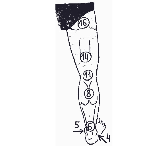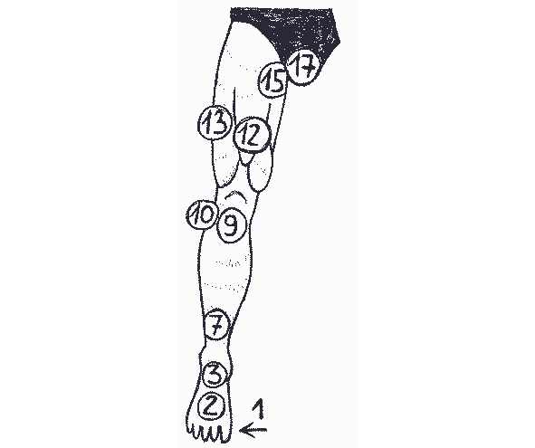 рисунок 8- Уязвимые точки ноги: 1- суставы пальцев ноги; 2- латеральный подошвенный нерв; 3- подъем стопы (прямо под голенью); 4- над внешней лодыжкой; 5- под внутренней лодыжкой; 6- ахиллесово сухожилие; 7- голень (малоберцовый нерв); 8- икроножная и камбаловидная мышцы; 9- коленная чашечка; 10- коленный сустав; 11- подколенная впадина; 12- бедро спереди; 13- бедро сбоку; 14- подколенное сухожилие; 15- паховая область бедра; 16- седалищный нерв (под ягодицей); 17- пах.